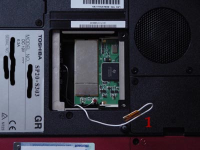 Der Mini-PCI-Slot sitzt hinter der rot markieren Klappe. Die beiden Schrauben